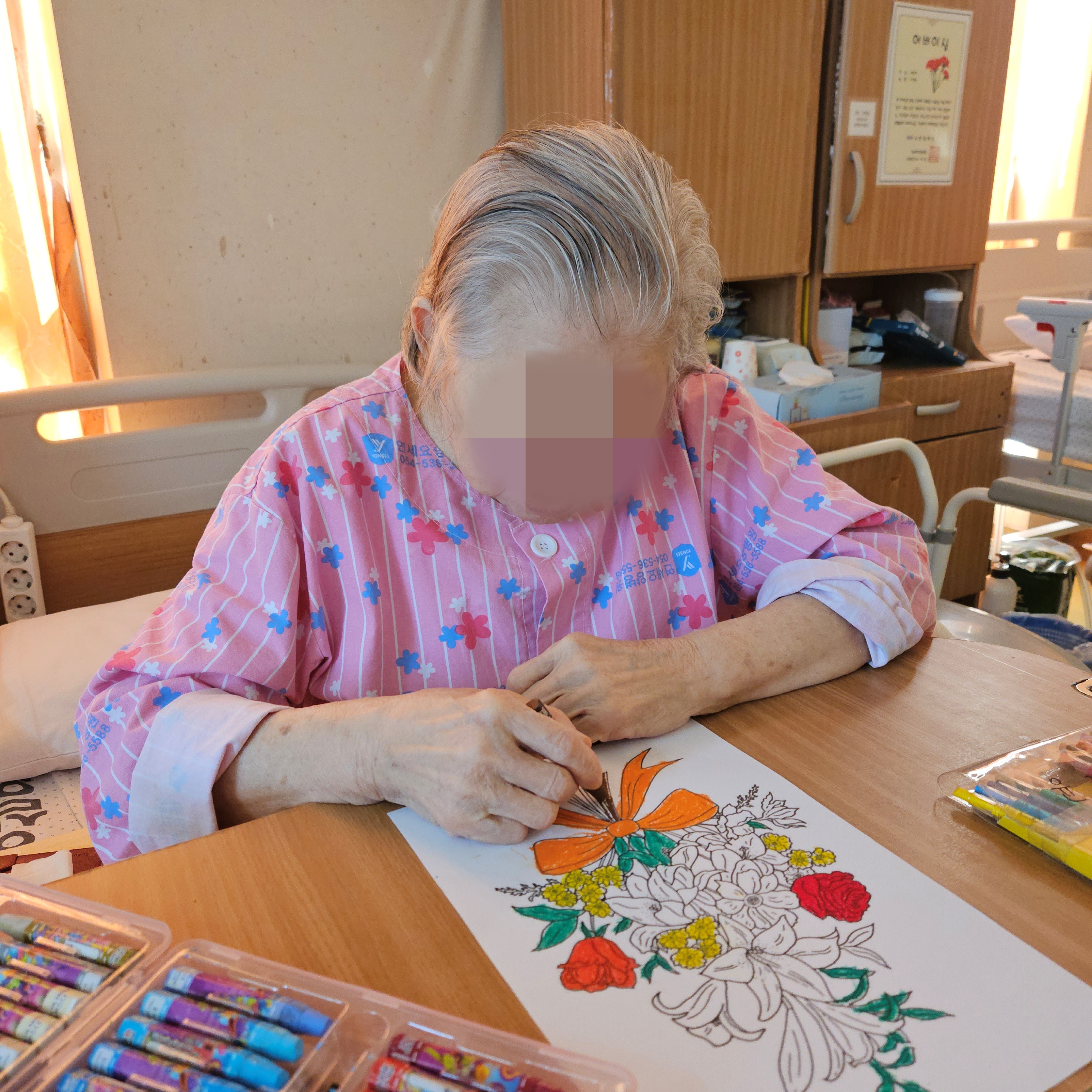 완성하신 그림을 들고 마음에 드신다며 심심할 때 옆에 두고 보겠다고 말씀하신 분도 계셨고 가족 분이 면회 오시면 보여 줄 거라고 자랑스럽게 말씀하신 분도 계셨습니다. 그림을 완성하는 성취감과 대화를 통해 조금이나마 어르신들의 병원 생활에 활력소가 될 수 있도록 노력하겠습니다~♥